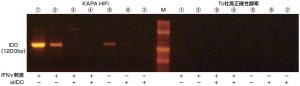 KAPA HiFi HotStart ReadyMixでは、IFNγ誘導性IDOのバンドの検出、およびsiRNAのノックダウンによるバンドの消失が確認された。