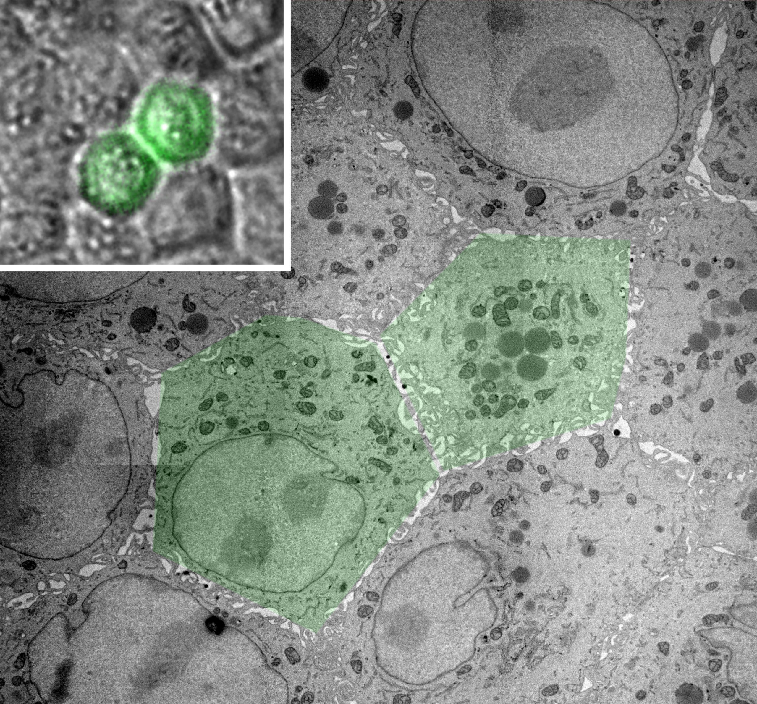 作品タイトル:正常細胞と変異細胞の混合培養の光顕-電顕相関観察
