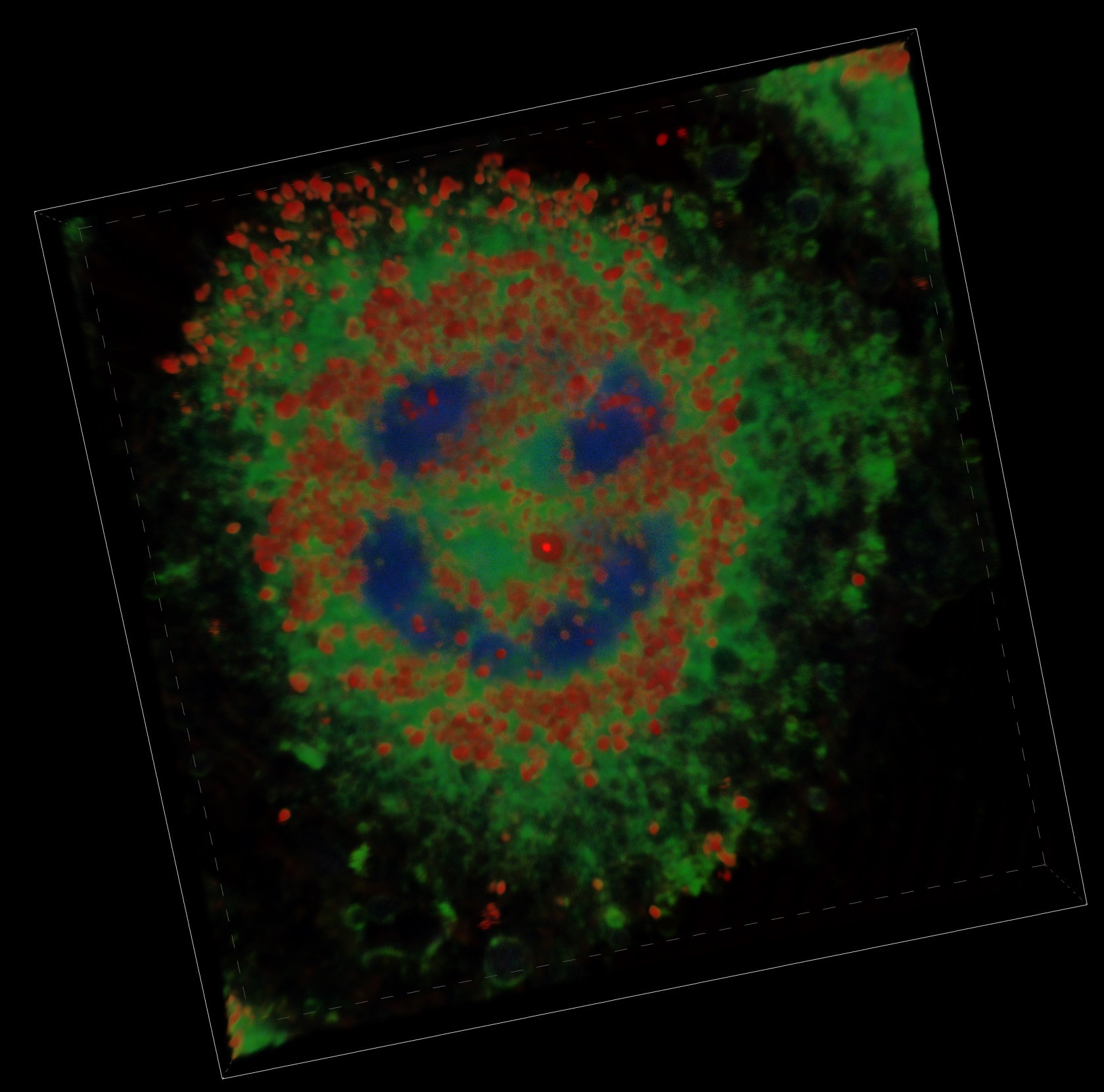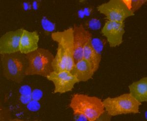 - EGFP(発がん関連タンパク質阻害タンパク質, 緑), mCherry(発がん関連タンパク質, 赤) Hoechst 33342 (DNA核, 青)