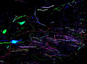 作品タイトル:アデノ随伴ウイルスベクターにて蛍光標識したマウス脳幹の神経細胞と軸索