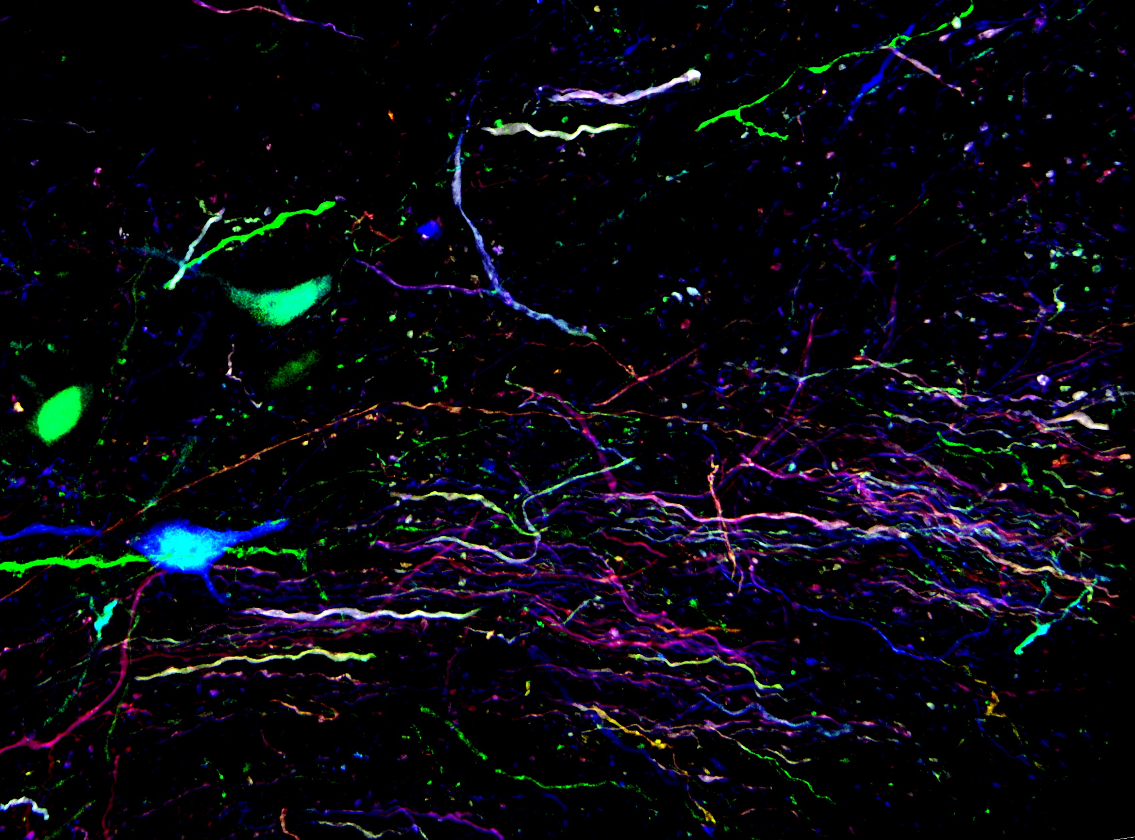 - いずれもアデノ随伴ウイルスベクターにて標識:CFP (neuron, 青)、YFP(neuron, 緑)、tdTomato(neuron, 赤)
