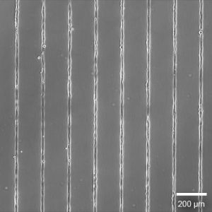- 細胞を直線状にアレイするために最適化された接着パターン(ライン形状 線幅20 µm/ピッチ170 µm)