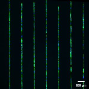 20 µmのライン上に播種されたヒト臍帯静脈内皮細胞(HUVEC)。細胞播種前にMatrigel®でプレコーティングを行った。2日間のインキュベーション期間の後、固定および染色を実施した。青色:細胞核(DAPI)、緑色:F-アクチン細胞骨格(Alexa 488コンジュゲート)、対物レンズ 10倍、ワイドフィールド蛍光顕微鏡