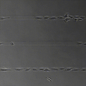 本製品で培養したHT-1080細胞(ラミニンプレコート済み)。細胞はマイクロパターン化されたラインに沿って誘導移動を示し、定義されたトラックから逸脱することなく、配列と方向性を維持した。