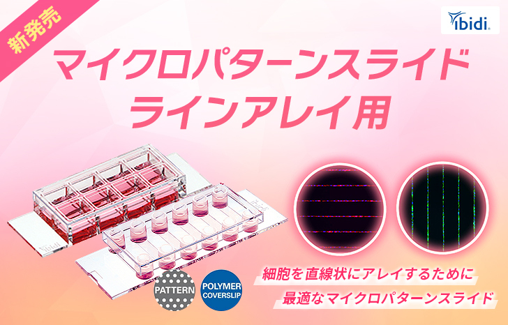 細胞接着パターンにibidi社独自の細胞接着加工「ibiTreat」を使用した「マイクロパターンスライド」に細胞を直線状にアレイするために最適化された「ラインアレイ用」が新たに発売となりました。これまでの「シングルセル用」「マルチセル用」に加えて新しいパターンが追加となります。