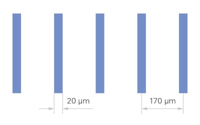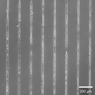 - 細胞を直線状にアレイするために最適化された接着パターン(ライン形状 線幅20 µm/ピッチ170 µm)