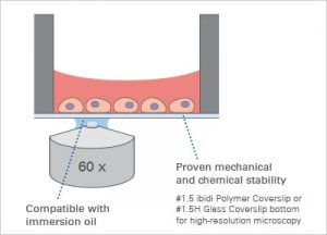- 底面は高倍率観察および蛍光観察に最適な光学クオリティを有するNo. 1.5 ibidiポリマーカバースリップ、または高精細No.1.5Hガラスカバースリップの2タイプをご用意