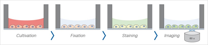 ibidi µ-Plate 12 Well は、細胞培養から固定・染色・イメージングまで、標準的な免疫蛍光プロトコールをプレート上でそのまま行うことができます。