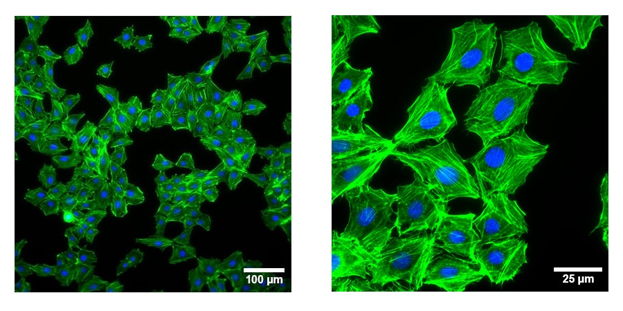 Rat1(ラット線維芽細胞)を µ-Plate 12 Well ibiTreat で培養後、固定し、ファロイジン-Alexa488(アクチン:緑)と DAPI(核:青)で染色した蛍光像。